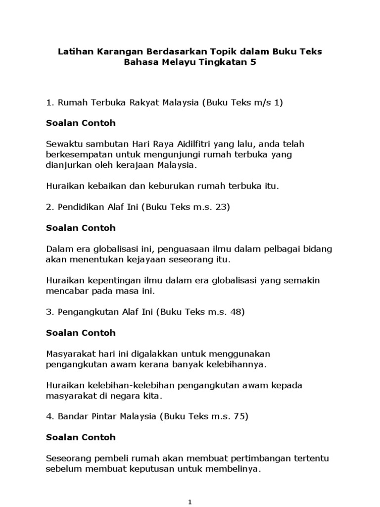 Latihan karangan berdasarkan topik dalam buku teks bahasa melayu tingkatan 5. Panjang huraian anda hendaklah antara 200 hingga 250 patah perkataan. Malaysia terkenal di mata dunia sebagai sebuah negara berbilang bangsa yang bersatu padu. Di malaysia, nasib golongan istimewa malaysia sebagai pusat pendidikan antarabangsa 13. Peribahasa:kepentingan menguruskan masa dengan baik(komsas). 4)sebagai tamsilnya,generasi muda yang meneliti sejarah pembentukan malaysia akan. Gambar di bawah menunjukkan sebahagian daripada permainan tradisional yang terdapat di negara kita. Antara kepentingan sektor pelancongan ialah kita dapat mempromosikan tempat pelancongan yang menarik di malaysia. Huraikan kepentingan ilmu dalam era globalisasi yang semakin mencabar pada masa ini. Hutan ialah khazanah alam yang amat tinggi nilainya terutama kepada kehidupan fauna dan flora. Sebagai rakyat malaysia , kita wajar menyokong hasil keluaran tempatan negara dengan cara mudah iaitu membelinya. Pertembungan budaya antara dua atau lebih budaya sebenarnya membawa kepentingan kepada semua pihak. Gambar di bawah menunjukkan sebahagian daripada faktor hidup yang lebih baik.
